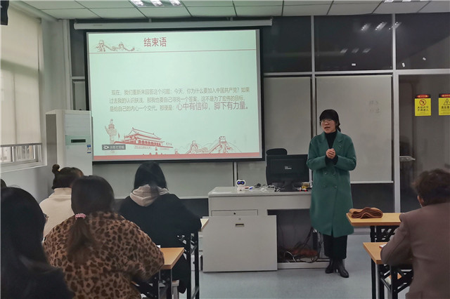 整个培训会议在同学们的热烈掌声中圆满结束。最后,由胡枫老师对此次培训做出总结,胡枫老师说道:“党的宗旨就是为人民服务,就意味着你要比群众多挑重担,多作贡献,多做牺牲,并且作为党员还要富有革命的自我牺牲精神,请大家不忘初心、牢记使命,以身作则,期望大家早日成为一名合格的党员,无论在何时何地发挥自己的光与热。”本次党课的学习,让大家对入党有了更加深刻的理解,对所承担的责任有了更加清醒的认识,对自身今后的发展有了更加明晰的思路。同学们纷纷表示更加坚定了自己的初心,积极向党组织靠拢,砥砺奋进,在未来创造出更好的成绩。不忘初心、牢记使命。