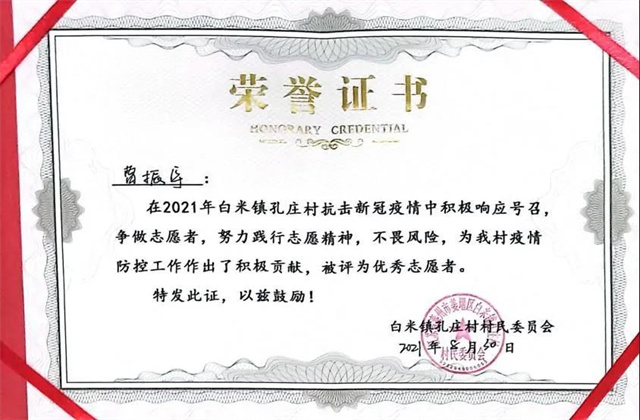 衡聪在江苏省徐州市邳州市碾庄镇大宋村疫情防控指挥部做的志愿者