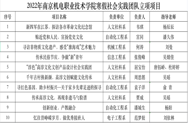 为深入学习贯彻习近平总书记在庆祝中国共产党成立100周年大会的重要讲话精神,进一步推动爱国主义教育与实践育人工作深度融合,引导机电学子以强国一代新青年的良好精神面貌迎接党的二十大胜利召开,庆祝中国共产主义青年团成立100周年。团委决定开展“小我融入大我,青春献给祖国”2022年米兰官方网页版大学生寒假社会实践活动。经自主申报,各团总支、青马班审核推荐,校级专家评审,确定以下10个项目为2022年米兰官方网页版寒假社会实践团队立项项目,并对立项的项目给予经费支持,现公示如下: