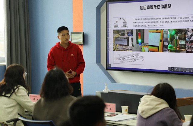 汇报作品分为哲学社科类和科技发明制作类,采取了线下汇报与答辩的方式进行评选。比赛由一号团队的汇报“乡村振兴背景下红色文化基因解码传承的探索与实践”拉开帷幕,他们提出随着各个国家之间的竞争日益激烈,未来国家之间的竞争是人才的竞争、科技的竞争,而这些竞争就需要具有深厚的爱国主义情怀和知识性能力的大学生作为支撑。二号团队的“长江您的变化”用文字的艺术向我们讲述了长江这些年的改变。三号团队带来的“工业机器人多功能考核系统”对现有工业机器人教学过程中存在的考核形式过于单一,安全系数不高等问题做出改良。四号团队的项目是“降温照明驱蚊衣”,利用多面技术达到三种功能兼容,满足消费者需求。