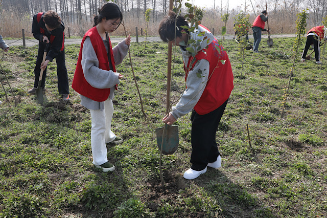 志愿者们乘车来到高淳水慢城,他们在园区内分成若干小组,领取植树工具。手持铁锹,脚踏泥土,志愿者们认真仔细地将一棵棵幼苗稳稳地栽入土中,随着一次次挖坑、回填、栽植、覆土,湖边、道路旁树起一道道生机勃勃的风景线。这些新栽的树苗,将在水慢城这片土地上扎根,成长为未来的树林,提供清新的空气和宜人的生活环境。
