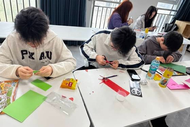 活动现场,星梦馆209内部热闹非凡,人头攒动,充满了青春的气息。来自不同年级、不同专业的同学们齐聚一堂,热情高涨,纷纷投入到制作飞花令作品的创意海洋中。他们各显神通,巧妙利用各种材料和工具,将一块块普通的材料化作一件件精美的艺术品。有的同学将古诗中的意象融入到作品的设计中。有的同学选择用剪纸的方式表现诗句中的意境。每个人的脸上都洋溢着灵动和喜悦的光芒,现场洋溢着欢声笑语,充满了活力四溢的氛围。