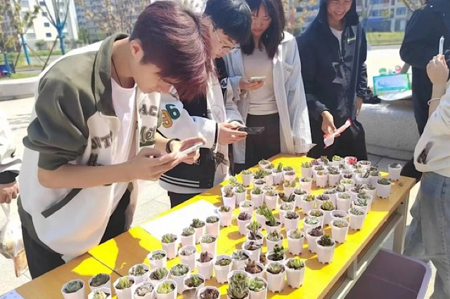 植一抹绿色,溢一片春光。食堂东广场的道路上被暖阳环抱,绿植领养的活动现场春意盎然。一盆盆春萌绿意、生机勃勃的多肉小绿植,等待着领养它的人到来。同学们络绎不绝,大家兴致勃勃地穿梭在展桌前,挑选着可爱俊俏的小多肉,感受着绿植的无限魅力。