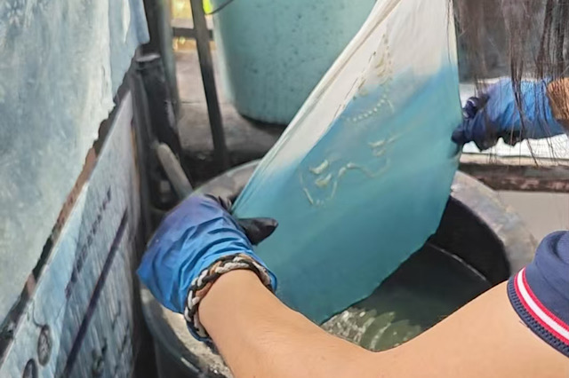 染色是蓝印花布制作中最具神秘色彩的环节。我们跟随师傅来到染缸前,那一大缸深蓝色的染液散发着淡淡的草药香气。师傅将刮好浆的布料放入染缸中,轻轻地搅拌着,让布料充分吸收染料。经过一段时间的浸泡,布料被取出,挂在通风处晾晒。当蓝色的布料在阳光下逐渐干燥,那美丽的图案渐渐显现出来。