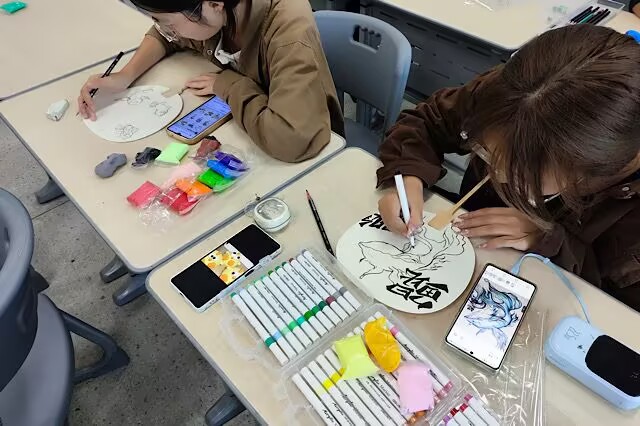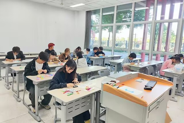 文创扇子手绘环节同样精彩纷呈。同学们在扇面上尽情挥洒自己的创意与热情,为现场增添了一抹亮丽的色彩。