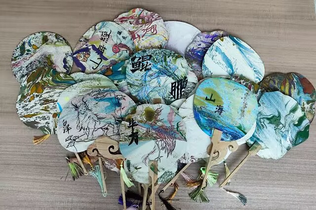 活动中,同学们纷纷拿起画笔,在扇面上绘制出自己喜爱的山海经异兽形象或奇幻场景。为了增添更多的色彩和视觉效果,他们精心挑选了多种不同颜色的颜料,使每一把扇子都独具特色,色彩斑斓。每一把扇子都承载着同学们的创意与热情,成为了一件件独一无二的艺术品。