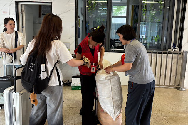 而校内宿舍区域,更是志愿者们倾注心力的“服务主战场”。从校门口到宿舍楼下,再到各个楼层的宿舍门口,志愿者的身影不停穿梭。遇到住在高层宿舍且没有电梯的新生,志愿者们毫不犹豫地扛起装满衣物的大箱子,一步一步往上走,汗水浸湿了马甲后背,却始终笑着说:“没事,这点重量不算啥!”进入宿舍后,志愿者们没有立刻离开,而是帮新生一起整理行李——把衣物叠好放进衣柜,将洗漱用品摆放整齐,还会指着宿舍里的设施细细讲解:“这个是空调遥控器,按这里调温度,记得离开宿舍时关掉;这边是电源插座,不要同时插太多大功率电器,注意用电安全。”