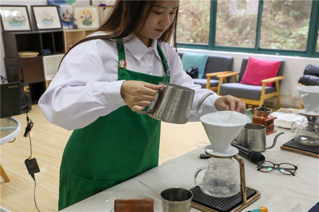 从折叠滤纸,到倒水温杯,倒入事先研磨好的咖啡粉,再分两次从内向外打圈注水和中心注水,三位同学经验丰富,精湛的技艺让现场观众蠢蠢欲动。