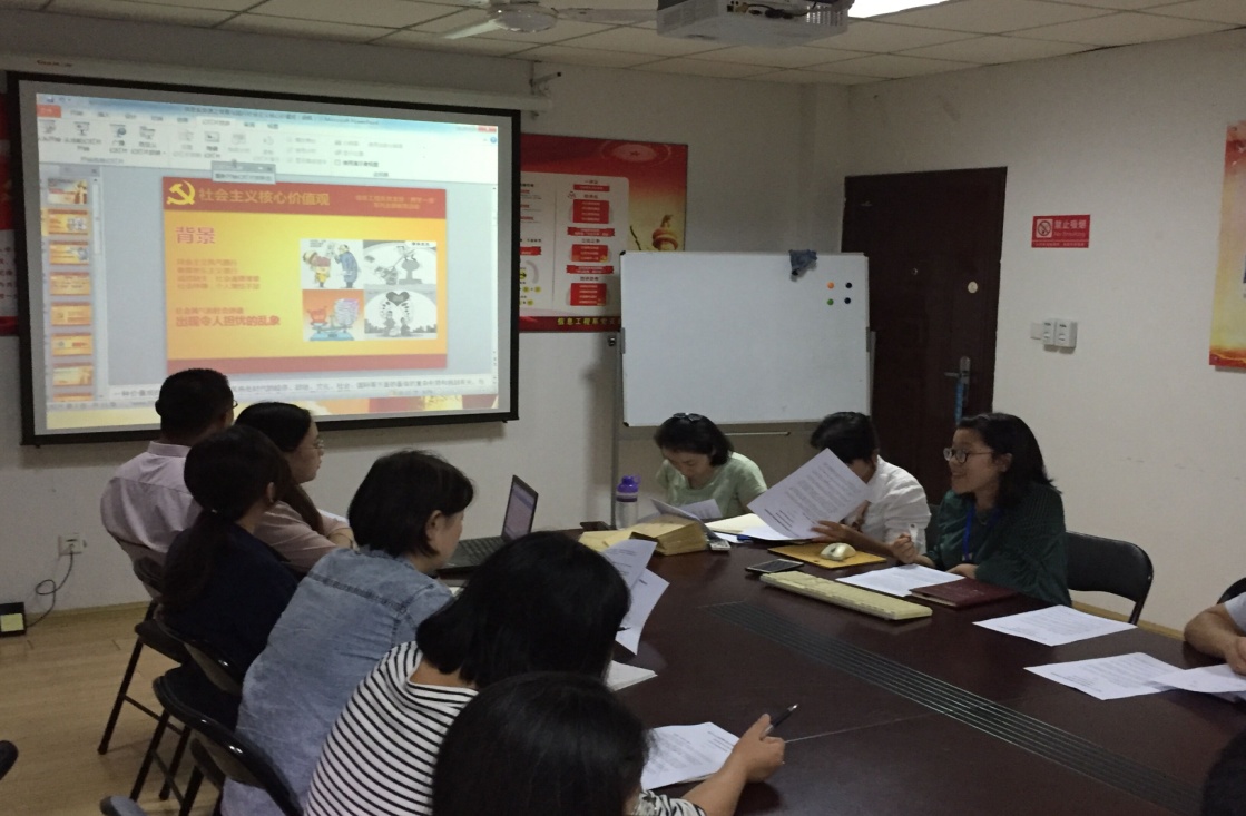 9月28日下午,信息工程系党支部开展主题为《培育和践行社会主义核心价值观》的党课学习活动。党课由支部副书记胡枫同志主讲,包括15名党员在内的全体教职工均参会进行学习。