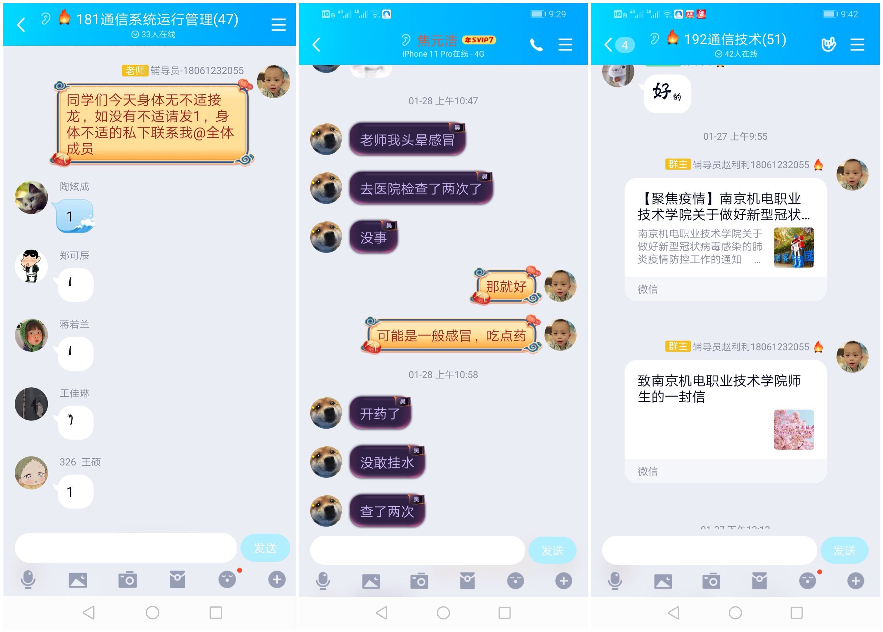为了准确掌握每个同学在家的信息,我们实行班级打卡制,每日上报自己身体情况。每天早上八点,全班同学在班级群里接龙打卡,身体有感冒、发烧等症状同学私下联系辅导员。每天上午12点辅导员将自己和所带班级学生情况上报系部。为了让学生对这次新型冠状病毒以及日常防护有更多的了解,班级群里定期推送米兰官方网页版学工处的相关文章,指导学生对疫情有正确认识,同时加强自身防护。指导大一大二学生安装超星软件,为网络授课做准备。