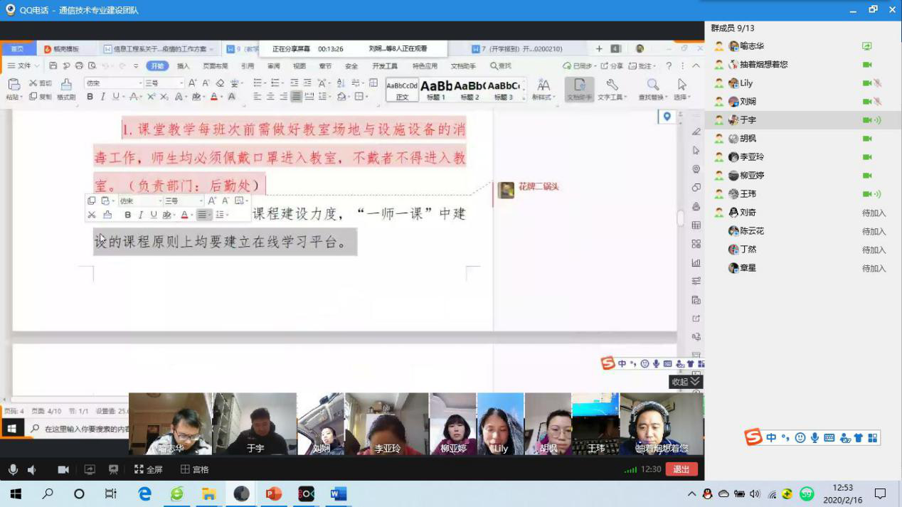 2月16日,通信教研室教师和辅导员召开了视频会议,学习学院颁布的关于疫情防控的文件。信息工程系王玮主任、系党支部书记胡枫、系副主任刘娴参与了此次学习、讨论。