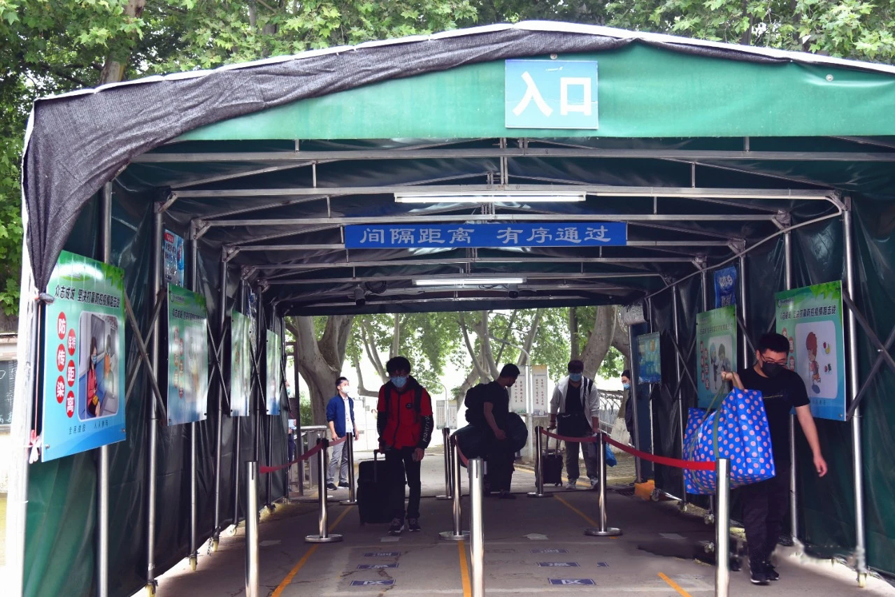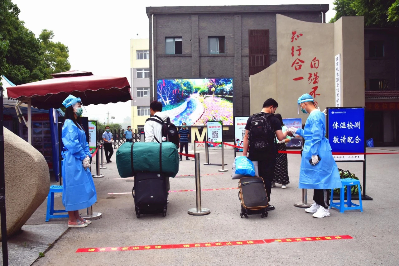 90路公交车站前,各系部接待点排成一排,信息工程系在最前面。那一声“同学,你是哪个系的?”成为师生在新学期第一面的问候语。核对信息,完成登记后,我们的志愿者老师接过行李,引导学生打开健康码和今日校园,走向学校。