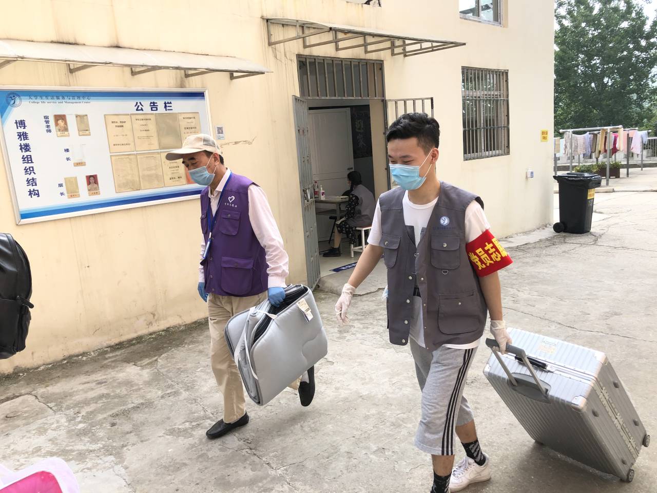 校门口测完体温、刷完绿色的健康码后,校园内的志愿者赶紧接过学生的行李。