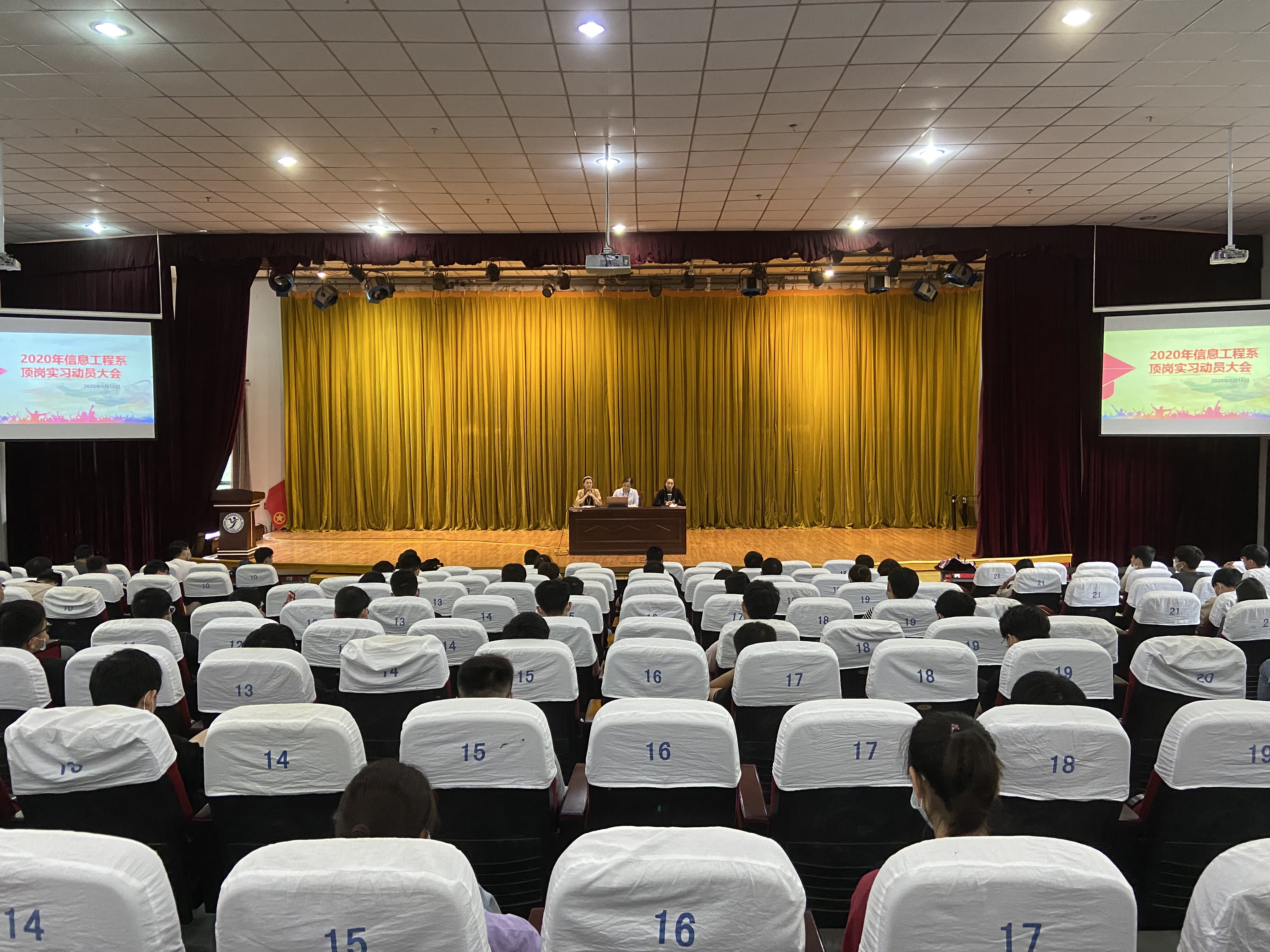 为了进一步完善我系毕业生项岗实习和就业工作,引导学生做好项岗实习的心理准备。2020年6月16日,信息工程系在学校报告厅召开2021届毕业生顶岗实习暨就业动员大会。系主任王玮、系书记胡枫及系副主任刘娴出席了本次大会,全体18级学生和辅导员参加了此次会议。
