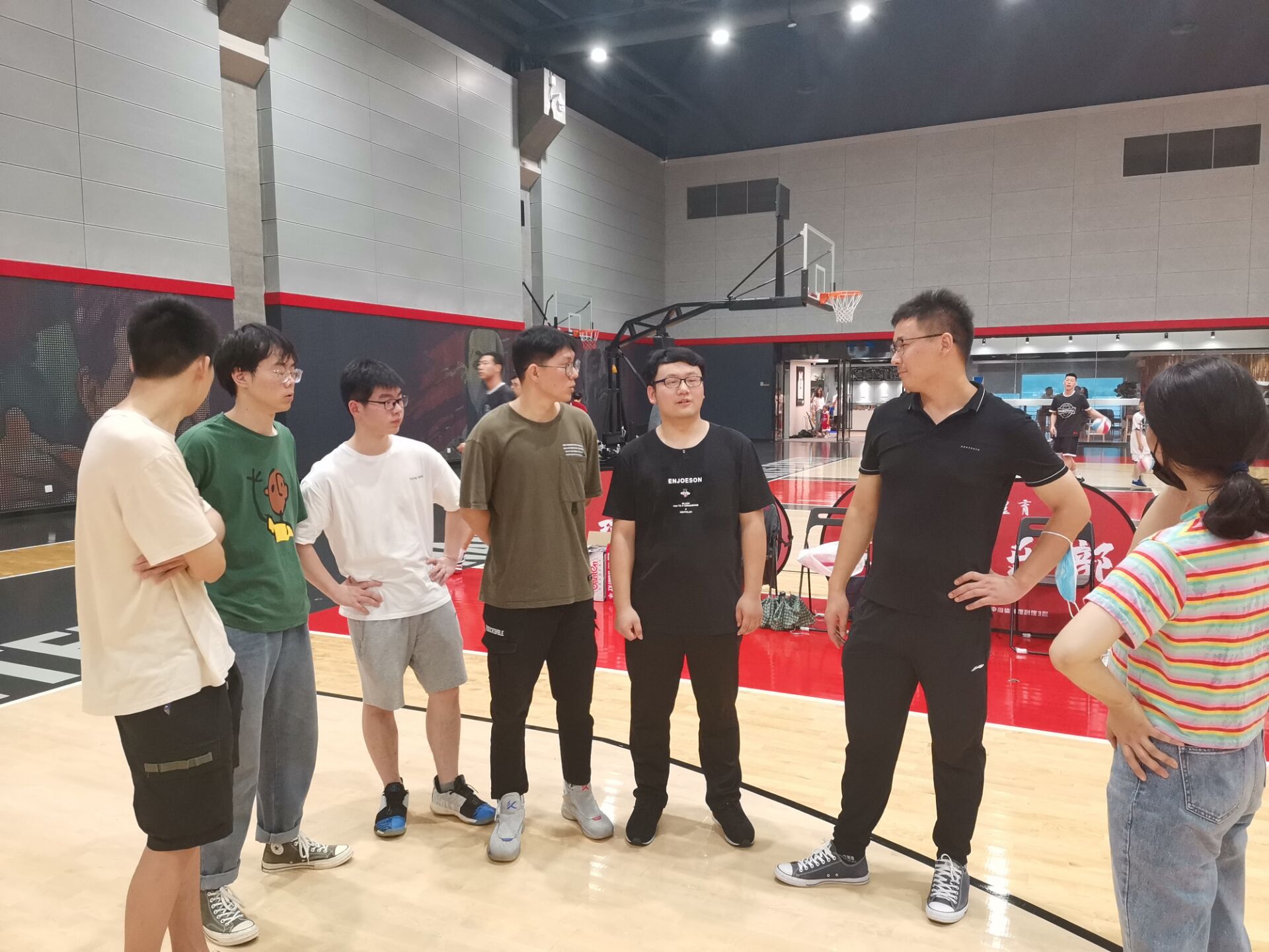 在第一天的志愿服务中,在于宇老师与承办方“南京奥体中心体育馆”的工作人员进行沟通以后,服务小队明白了自己的任务。大家将凳子搬到裁判席的两侧,为接下来七天比赛中的队伍们搭建休息的场地,然后开始引导参赛球员们开始进场,为他们解决对场地的疑问,并且为参赛队伍在赛前搬送矿泉水。在比赛即将开始时,服务小队四四分组,在记分牌下迅速就位,根据裁判的手势来为比赛进行计分翻分。在比赛结束以后,服务小队立马对比赛区域进行打扫,保持场馆的整洁。一天的志愿服务结束以后,所有人都很疲惫,但是也很兴奋,每个人都在分享自己的所见所闻与感想。在接下来的六天实践活动中,实践服务小队都表现了极大的热情,志愿者谈建、王子一等人以及在指导老师于宇老师的带领下,围绕赛场秩序维护、环境卫生清理、现场设施布置、赛事直播等方面做好各项现场服务工作。