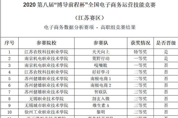 曹安林、殷凯老师指导的数据分析赛项的2支队伍,“荒野行动”队(赵雅慧、黄安男、吴松)和“嘎嘣脆”队(尹薛杰、鲍宇涵、赵晨)也取得了历史性的突破,同时摘得省赛一等奖,其中“荒野行动”队成功晋级全国总决赛。