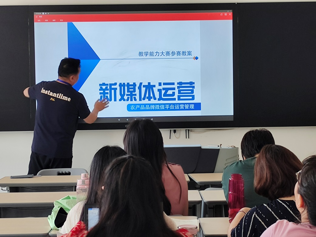 施老师首先带领大家学习《2021年江苏省职业院校教学大赛方案》,然后分享本次移动商务团队参赛的经验,具体讲解了专业核心课程《新媒体运营》参赛前的准备工作,组建四人参赛团队,录制每人10分钟的教学视频,编写专业人才培养方案、课程标准、参赛教案、电子教材、教学实施报告等文档材料,反复打磨各环节,应对评委随机抽、随机讲,每个细节都尽自己所能准备细致。 本次分享激起大家的兴趣和关注,老师们纷纷提问讨论,比如为什么选这门课,参加的哪一组比赛,视频的时间如何把控,如何吸引评委老师的关注,让比赛更有机会获胜等。 最后施老师激励大家,围绕学院专业建设,各专业积极参与,先参加省赛再进入国赛。