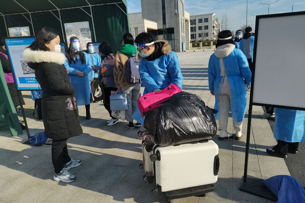 志愿者和老师们身穿蓝色防护服,面带微笑,在寒风中等候每一位学子的归来;志愿者们在校门口检查核酸报告、行程码、健康码等,贴心地帮助同学们搬运行李;各班辅导员老师去每个宿舍看望每一位报到的学生。宿舍楼,宿管阿姨们早早的将宿舍楼道打扫的干干净净,让每一位离开家的学子再次感受到了家的温暖。
