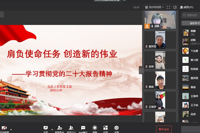 深学细悟,推动党的二十大精神落地生根。信息工程系党支部依托腾讯会议平台,于2023年3月30日晚组织“原原本本、学深悟透”政治理论学习,开展党的二十大报告专题学习第一讲。支部组织委员俞宝莹同志主持会议,支部全体党员及普通教职工参加学习。