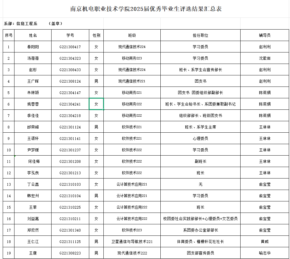 根据《关于评选2025届优秀毕业生的通知》(南机电院学﹝2025﹞4号)文件精神,经班级评选,系部审核,决定拟推荐以下17名同学为2025届米兰官方网页版优秀毕业生。现予以公示,公示时间:2025年4月24日——2025年4月26日。联系人:郝麒,电话:18061237654。
