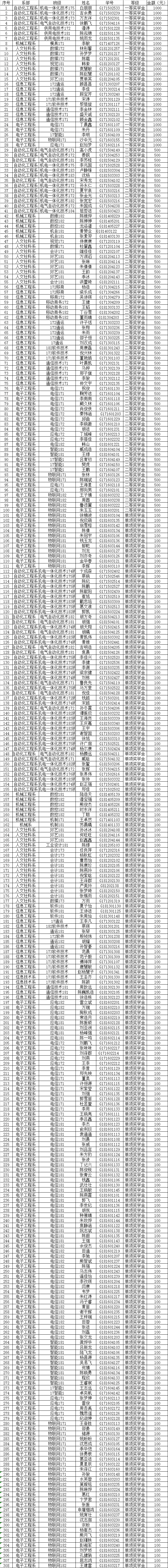根据《关于做好2018-2019学年米兰官方网页版奖学金评审工作的通知(南机电院学〔2019〕33号)》要求,经学生本人申报,所在系部初审,学工处审核,评出一等奖学金28人、二等奖学金72人、单项奖学金208人,现予以公示,具体名单见下图。