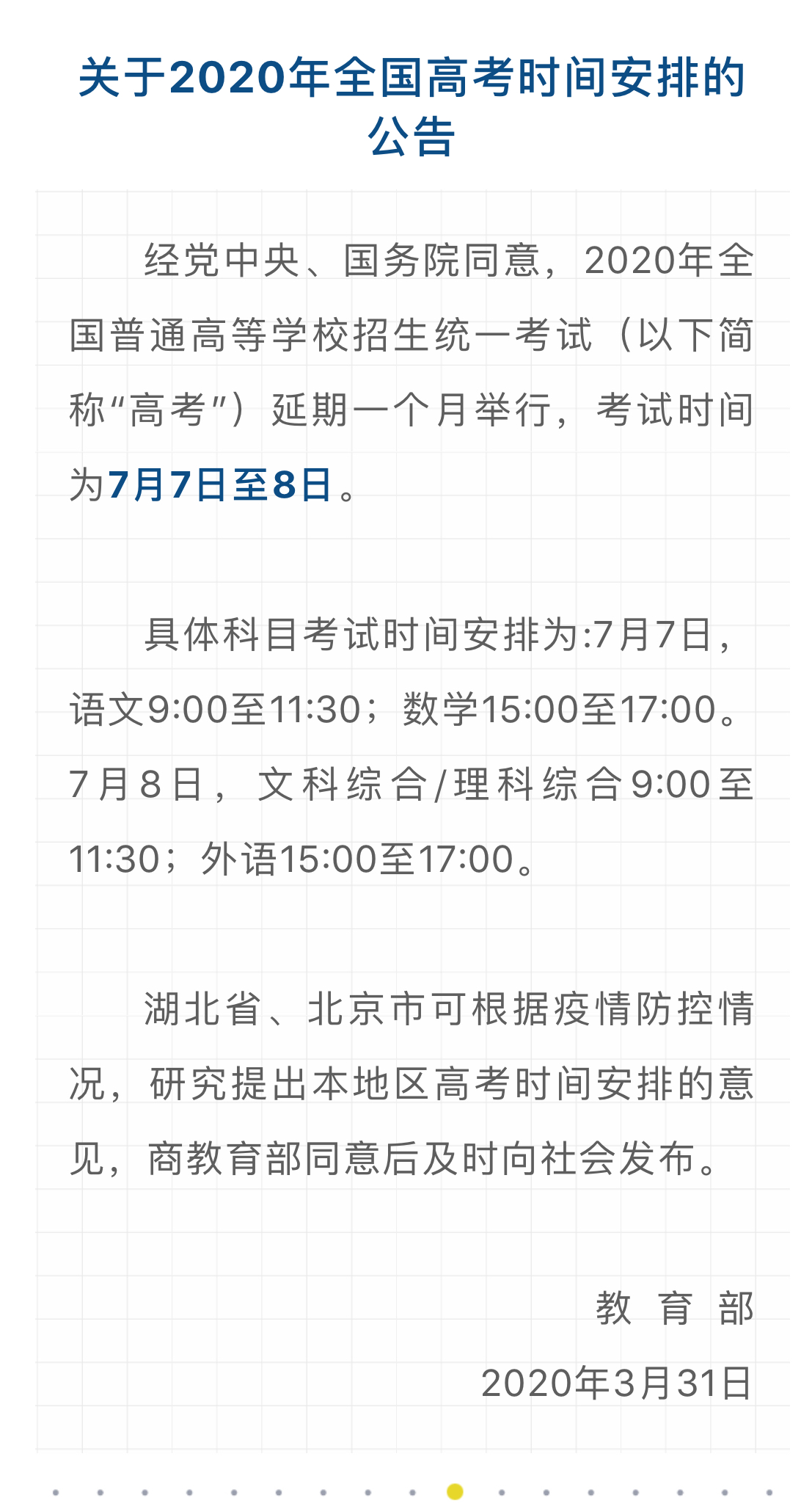 速递!2020年全国高考延期一个月举行,考试时间为7月7日至8日