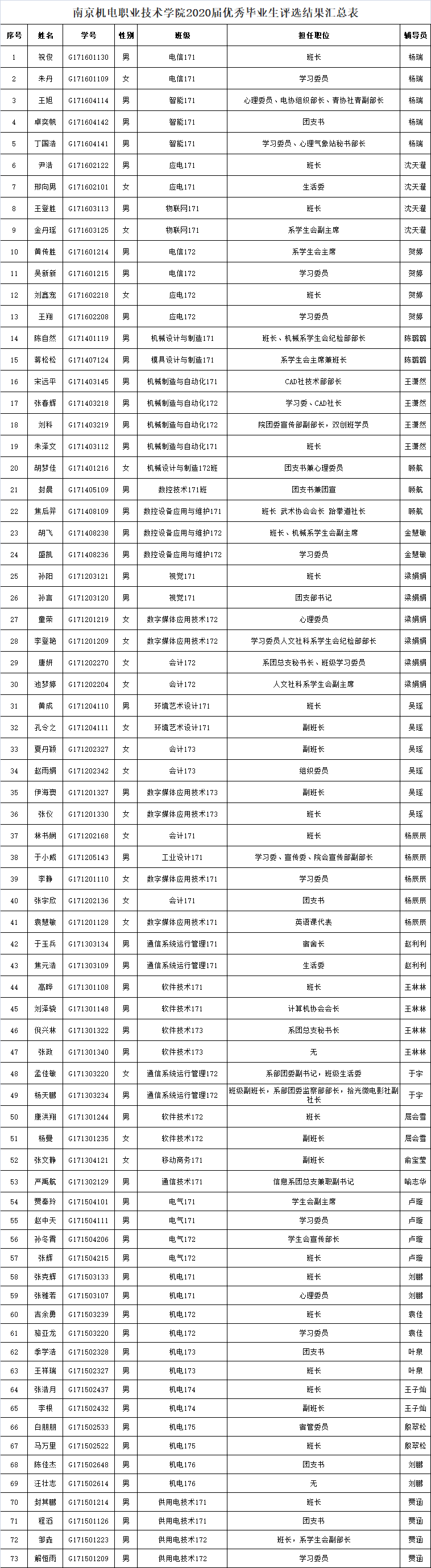 根据南机电院 学[2]号《关于评选2020届优秀毕业生的通知》,经班级评选,系部审核,学工处复核,决定拟推荐以下73名同学为2020届米兰官方网页版优秀毕业生。现予以公示,公示时间:2020年6月24日—2020年6月30日。联系人:宁燕,电话:025-84190262,18061230078。