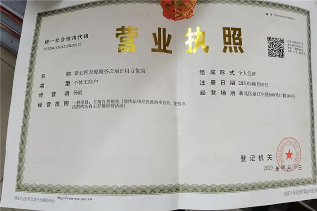 2020年4月—至今:新北区龙虎塘谷之雨日用百货店(法人)