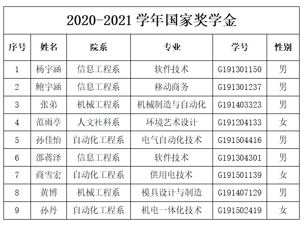 根据《教育部财政部关于印发<本专科生国家奖学金评审办法>的通知》(教财函〔2019〕105号)以及《江苏省学生资助资金管理办法》《江苏省学生资助管理实施细则》《省教育厅关于做好2021年普通高校国家奖学金有关工作的通知》苏教助函〔2021〕12号文的相关精神。我院认真落实国家奖学金评审相关细则,各系部通过召开系部国家奖学金评审小组会议,认真贯彻落实国家奖学金评定要求,本着公开、公正、公平的原则,经学生个人申报,班级评议通过,上报系部评议小组,经系部评议审核通过,公示完毕。正式上报学院大学生资助管理中心,经学院大学生资助管理中心复审,召开学院2020-2021学年国家奖学金评审会,拟确定9位同学为米兰官方网页版2020-2021学年国家奖学金获得者。