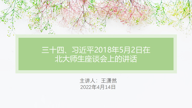王潇然老师就《习近平2018年5月2日在北京大学师生座谈会上的讲话》内容进行解读和学习心得分享,着重解读对“五四精神”、“内涵式发展道路”、“才者,德之资也;德者,才之帅也”的理解。习近平总书记在座谈会上给广大青年提出的几点希望:一是要爱国,忠于祖国,忠于人民。二是要励志,立鸿鹄志,做奋斗者。三是要求真,求真学问,练真本领。四是要力行,知行合一,做实干家。王老师结合工作实际,提出心得体会。