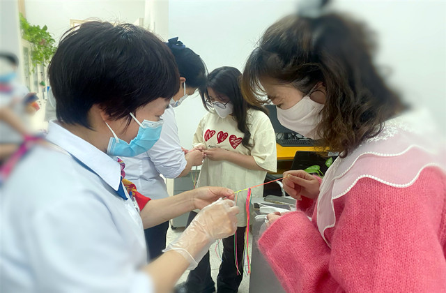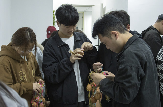 4月17日,“传统工艺我传承 蛋袋编织忆民俗”---五彩蛋兜编织活动在宿舍区开展,学工处大管中心周长花老师准备了五颜六色的彩线,并为大家演示蛋袋的编织方法。听完讲解,宿管阿姨和同学们都迫不及待的动起手来,先把不同颜色的线套在线圈上,分别对折并打上8组结,再将每组相连的两根彩线按约1厘米的长度进行编结,编完4圈后打结,很快宿管阿姨手中的彩线就变成了一个个五彩蛋袋,尽显传统文化的魅力。