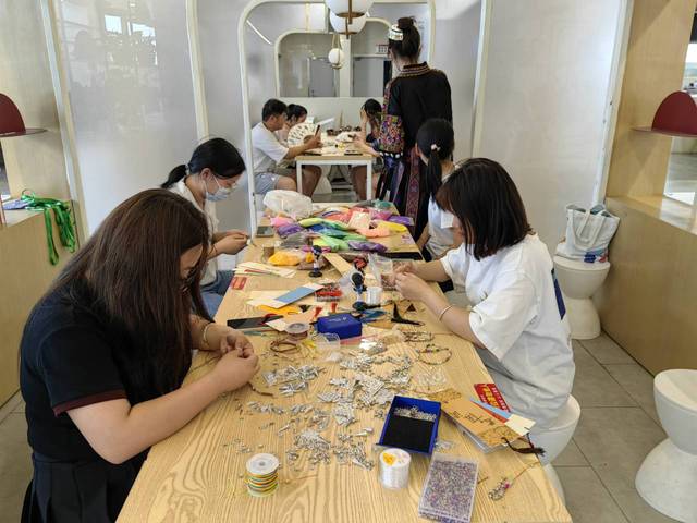 本次手工DIY活动分为编特色手绳、制作民族耳饰、用不同文字书写书签、粘土制作等四个项目。白族的谷蕊瞳介绍了各个手工项目的内容,并进行详细的教程讲解。随后,妙趣横生的DIY手工制作活动正式开始。同学们两两一组,兴致浓厚,积极参与,通过写书签、做民族耳饰粘土特色手绳项链等方式,充分发挥自己的想象力和动手能力,认真地进行思考与制作,其乐融融,气氛热烈。经过三小时的团结协作,一件件精美的手工作品陆续完成。在活动中,各民族同学加深了感情,加强了互动,增进了友谊,锻炼了动手能力,更好地了解了丰富多彩的民族文化。