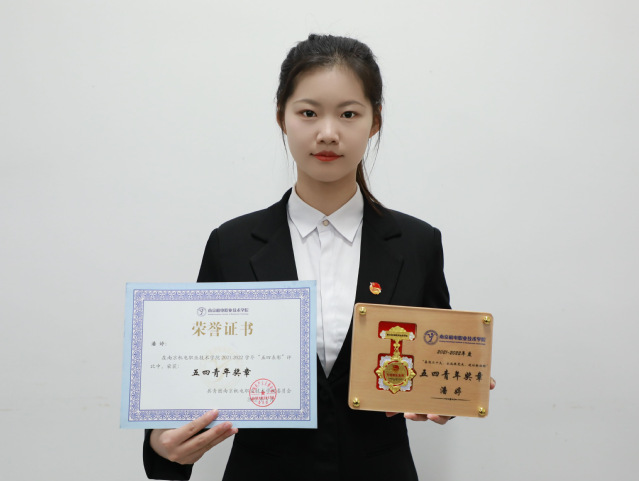 潘婷,女,汉族,中共预备党员,自动化工程系供用电技术专业学生。在校期间担任校学生会副主席、学院学生资助宣传大使、机电214班级助理辅导员等职位。先后获得国家奖学金、国家励志奖学金、中国大学生自强之星、江苏省“优秀学生干部”、江苏省“优秀毕业生”等荣誉。对于自身发展,她也有清晰明确的未来规划,在专科赛道70余名选手中脱颖而出,摘得了江苏省大学生职业生涯规划大赛特等奖的荣誉。