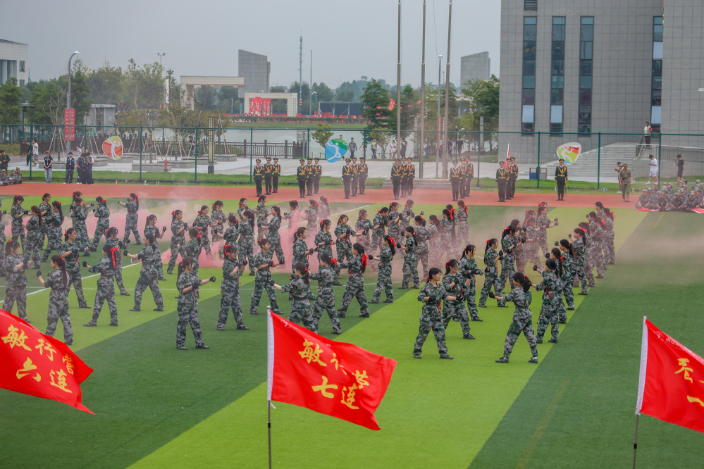 分列式后,各营学生还依次进行了擒敌拳、匕首操、战术救护等军事科目演示。机械工程系106人擒敌拳方阵气势如虹,人文社科系女生匕首操表演刚柔并济,战术救护演示展现了战场协同与应急救援能力,赢得了全场阵阵掌声。
