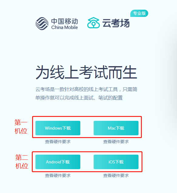 正面机位(第一机位)和反面机位(第二机位)都是智能手机,根据手机操作系统,下载安装Android版或IOS版的“云考场-专业版”。