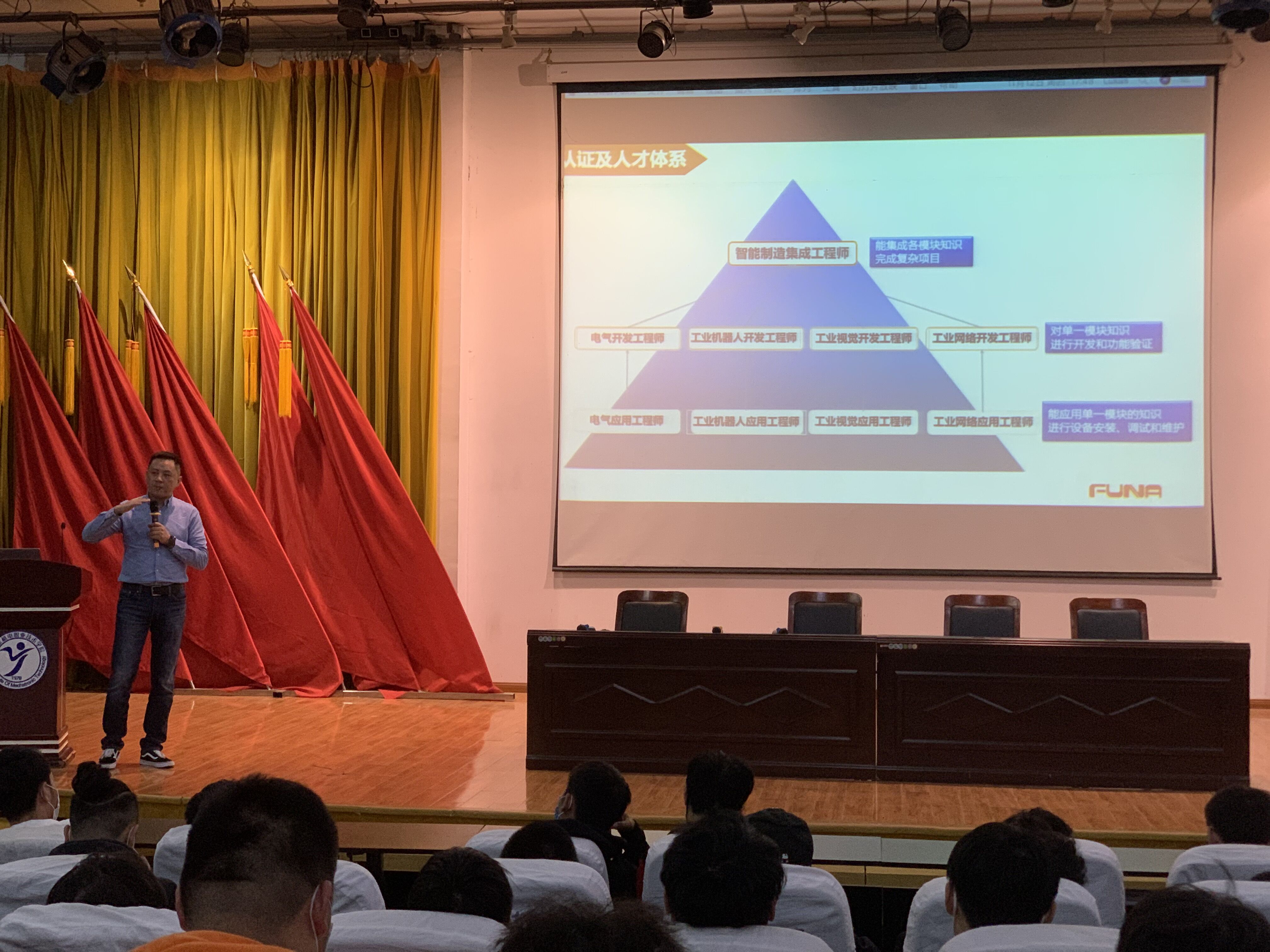 11月12日下午5点20分,富纳智能制造学院在报告厅面向电气自动化专业群学生,进行了现代学徒制试点班组建的宣讲。富纳智能制造学院校企合作部经理李熙、研发部经理陈勇出席了宣讲会,我院智能制造学院执行院长潘理平、自动化工程系支部书记高水冕以及相关教师参加了宣讲会。
