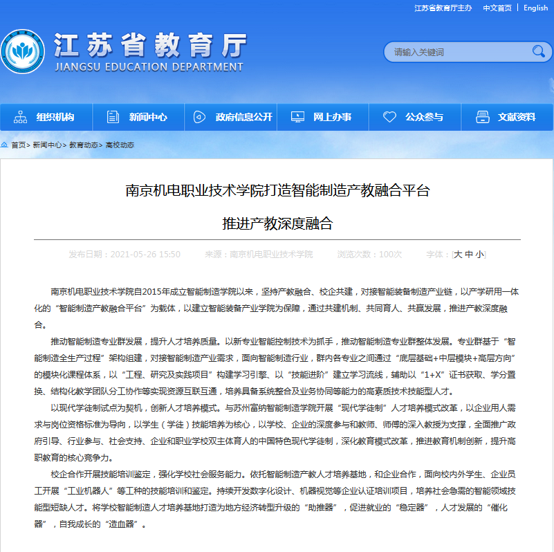 5月26日,江苏省教育厅官网“高校动态”栏目刊文:《米兰官方网页版打造智能制造产教融合平台,推进产教深度融合》,报道我校智能制造学院建设亮点。