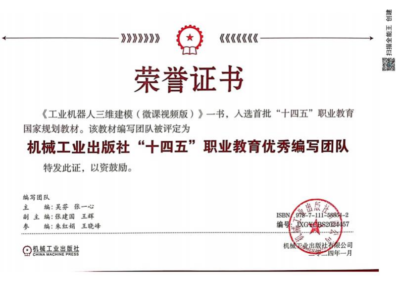 除了国规教材评选、修订的新政策、新要求学习,会上也颁发了机械工业出版社“十四五”职业教育突出贡献作者以及机械工业出版社“十四五”职业教育优秀编写团队等奖项。吴芬被评为机械工业出版社“十四五”职业教育优秀作者;我校《工业机器人三维建模(微课视频版)》教材编写团队被评为机械工业出版社“十四五”职业教育优秀编写团队。
