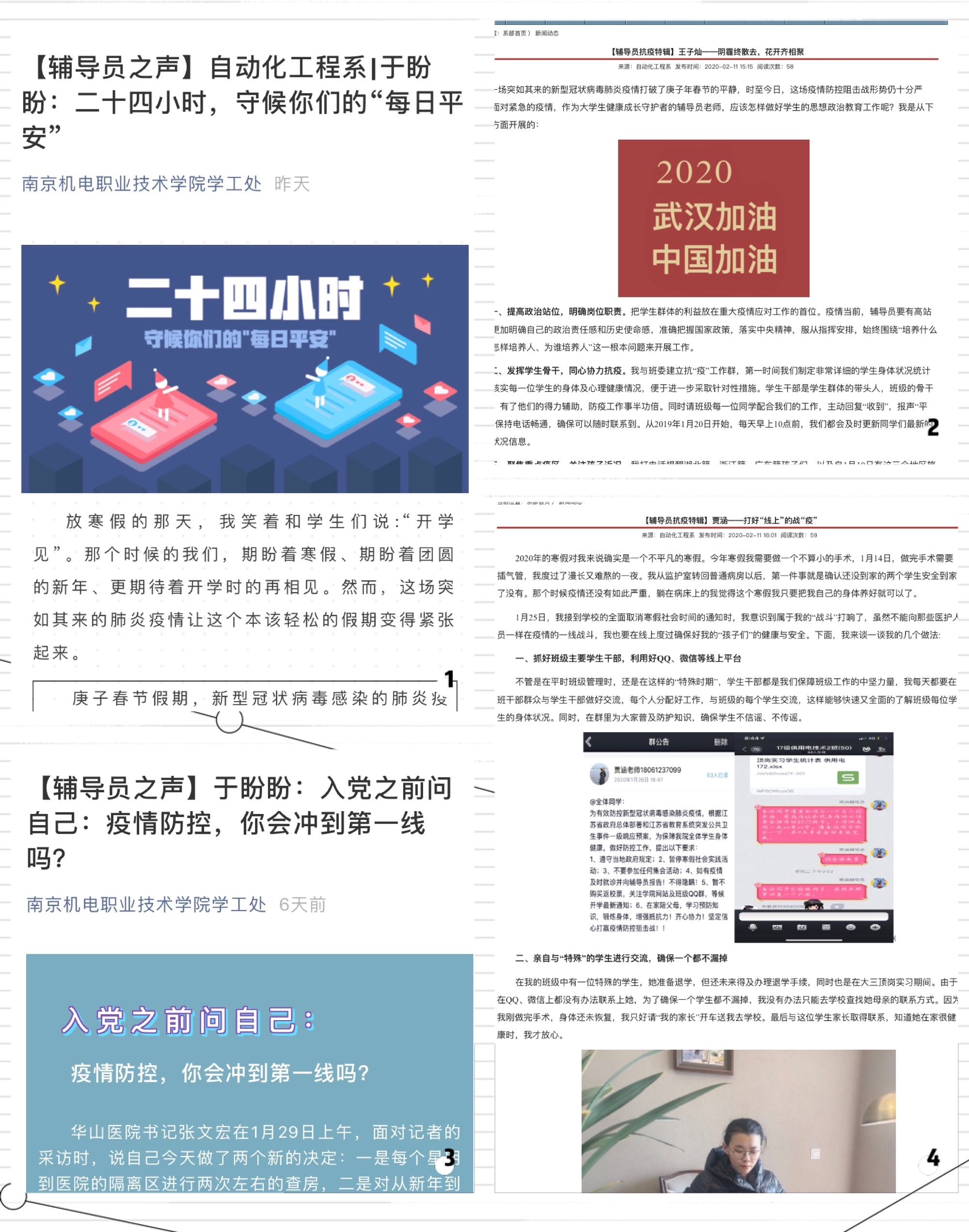 系部通过学工微信及系部网站,在平台发布《入党之前问自己:疫情防控,你会冲到第一线吗?》、《打好“线上”的战“疫”》、《24小时在线,守候你们的"每日平安"》、《阴霾终散去,花开齐相聚—我与学生肩并肩走好抗“疫”之路》、《涵姐系列之-让我们更有意义成长》等信息,教育引导师生不信谣、不传谣,广泛宣传疫情防护科学知识,引导广大师生员工增强防护意识,提高防护能力。传播载体全方位发声,加强舆论宣传,助力疫情防控。