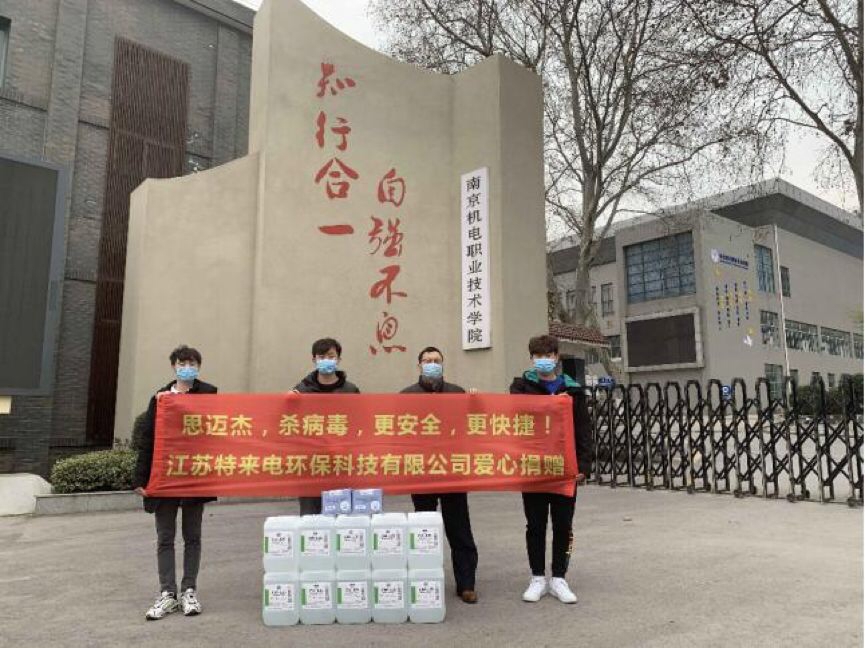江苏特来电环保科技有限公司副总经理闫斌校友(2017届检测技术及应用)、销售经理徐浪校友(2018届供用电技术)和项目经理梁建伟校友(2019届供用电技术专业)心系母校,向母校捐赠消毒水和口罩等抗疫物资,支持学校的疫情防控工作。闫斌等三位校友表示:疫情无情人有情,希望学弟学妹安全健康返回校园。祝愿母校越办越好,顺利搬迁新校区。