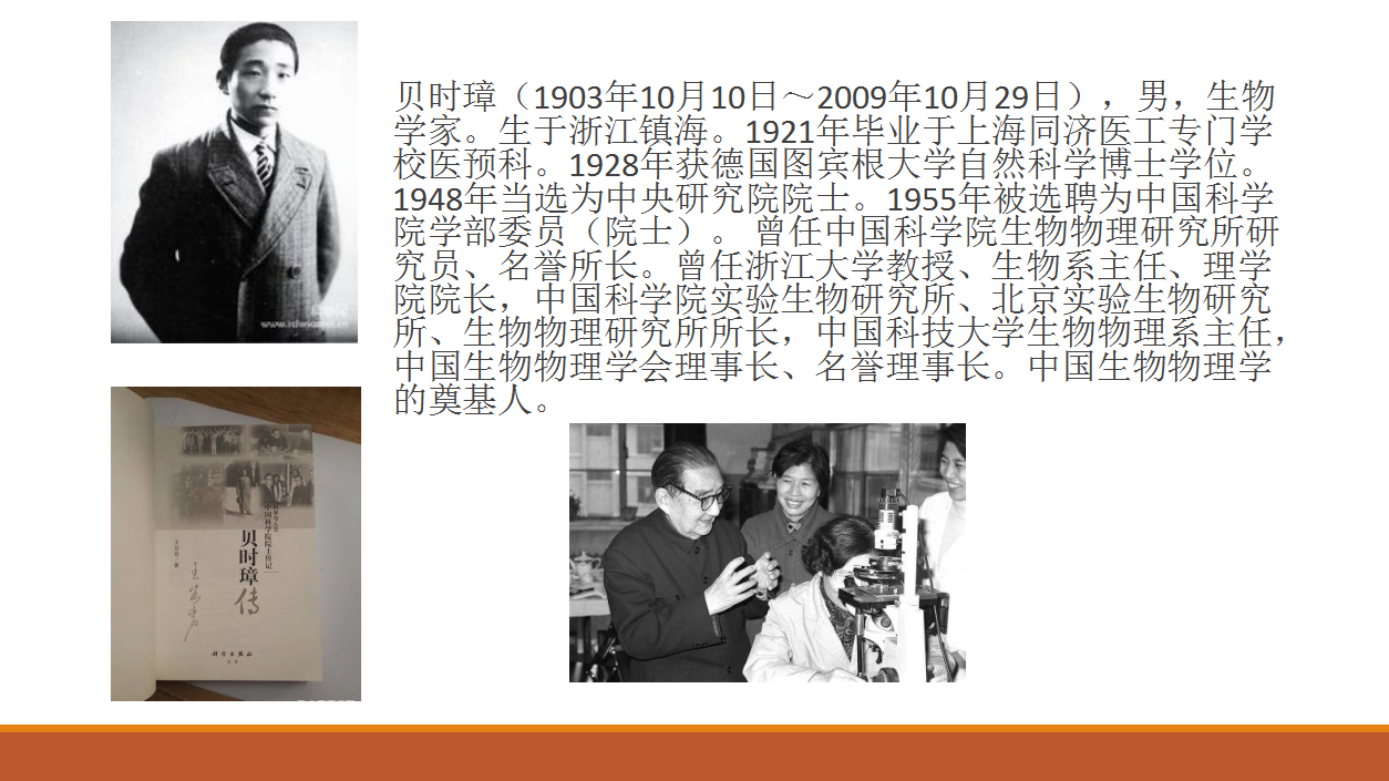时代楷模——贝时璋,一直从事实验生物学研究工作,对生物的细胞常数、再生、性转变以及细胞的结构和分裂等作了研究,发表了一系列论著。20世纪30年代初期,在丰年虫中间性的性转变过程中观察到细胞重建现象。相继在丰年虫、鸡胚早期发育、小鼠造血系统(骨髓)、根瘤菌和沙眼衣原体等方面进行了细胞重建的研究,首次发现细胞的繁殖增生除细胞分裂之外,还存在着另外一条途径—细胞重建,创立了“细胞重建学说”。国家天文台将1996年发现的第36015号小行星命名为“贝时璋星”。