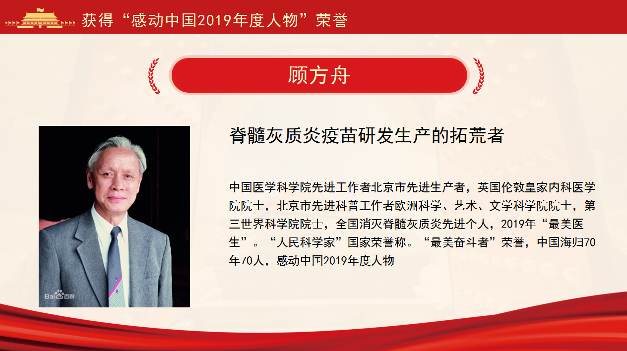 十大感动中国人物——顾方舟,我国著名的老一辈医学科学家、病毒学家、教育家和社会活动家。他专门从事脊髓灰质炎研究40余载。他是中国研究脊髓灰质炎病毒和研发脊灰活疫苗的第一人,1959―-1961年他和同事们先后成功研制出三批脊灰活疫苗共2000万人份。他在昆明筹建了疫苗生产与研究基地――中国医学科学院医学生物学研究所,该所自1960年建所以来至今向国家提供疫苗40多亿人份,对我国消灭脊灰起到了关键性作用.他是脊髓灰质炎疫苗研发生产的拓荒者。中国医学科学院先进工作者北京市先进生产者,英国伦敦皇家内科医学院院士,北京市先进科普工作者欧洲科学、艺术、文学科学院院士,第三世界科学院院士,全国消灭脊髓灰质炎先进个人,2019年“最美医生”。“人民科学家”国家荣誉称。“最美奋斗者”荣誉,中国海归70年70人,感动中国2019年度人物。
