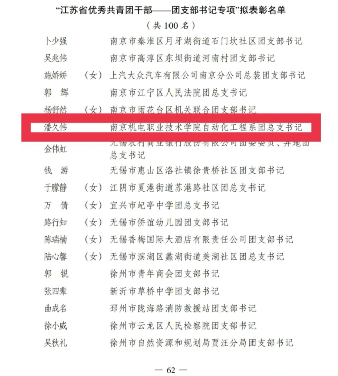 日前,共青团江苏省委下发《关于表彰“江苏省五四红旗团委(团支部)”、“江苏省优秀共青团员”“江苏省优秀共青团干部”的决定》(团苏委发﹝2021﹞9号),我系团总支书记潘久伟老师被评为2020年度“江苏省优秀共青团干部”。
