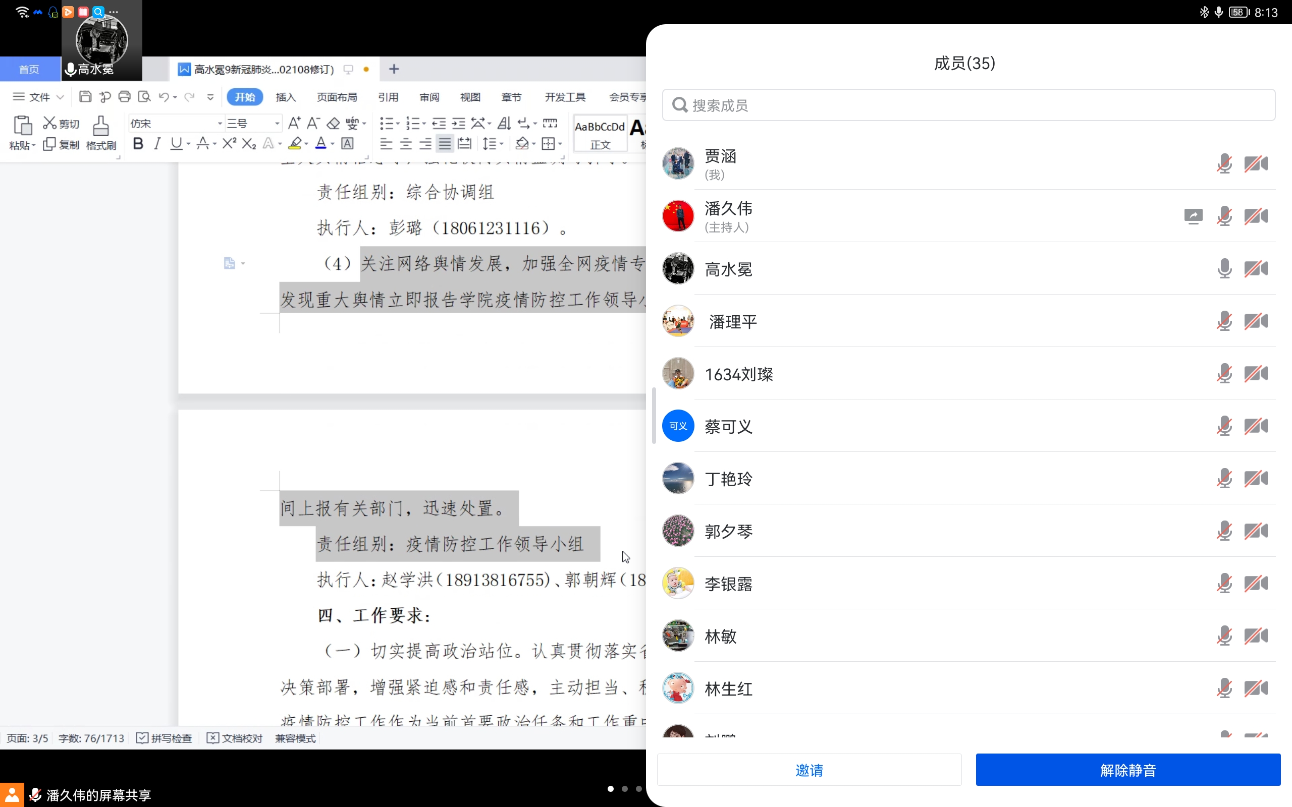 最后,潘主任作会议总结。他说,在疫情防控工作中,一定要做到思想与行动上的高度统一。在思想上,必须要高度重视,把疫情防控工作作为当前最重要的工作来抓,提高自我防护意识,严格遵守学校的疫情防控要求;在行动上,要扎实细致地开展工作,遵守制度流程,每天按时打卡上报体温,同时,密切关注学生的情况,确保排查工作的严密性与准确性;把师生的生命安全和身体健康放在第一位,提高责任意识,确保打赢疫情防控阻击战。
