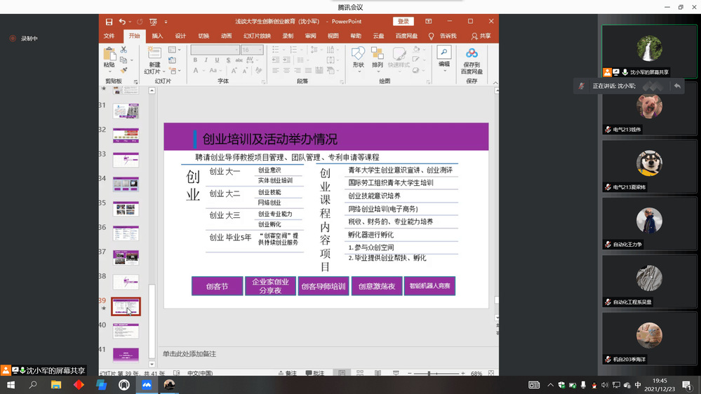 为提升大学生创新创业能力,激发大学生创业意识,宣传创业理念,培养创新创业精神,丰富大学生的创业知识,12月23日下午19:00,邀请了学院就创业中心沈小军主任给系部2020级和2021级在校生1148名学生做了一场创业专题线上讲座。