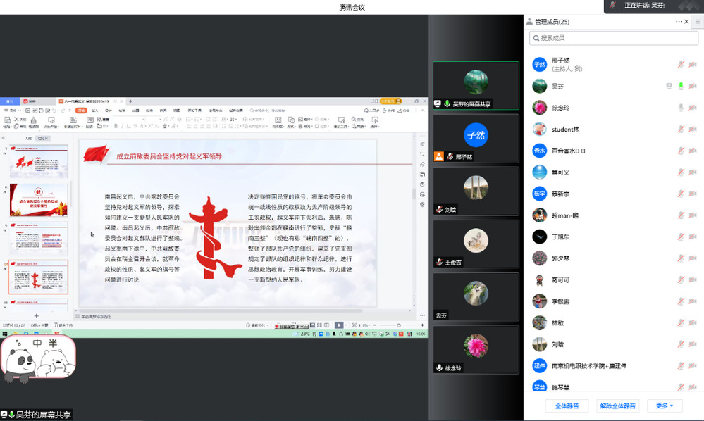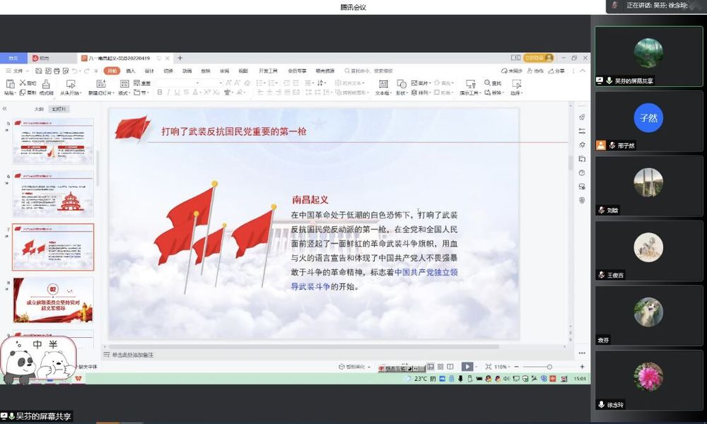 3月22日下午,自动化工程系通过线上腾讯会议,开展“党的故事我来讲”暨党员一人一故事活动,全体教职工参加学习。本次活动由吴芬同志担任主讲人,分享的主题是:八一南昌起义。