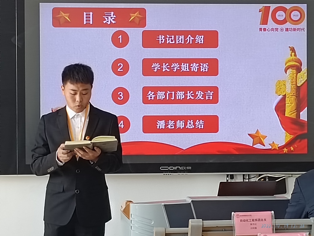 随后,19级、20级团总支副书记以视频的形式对新任团干部们送上寄语。紧接着各部门的部长纷纷亮相,简单的介绍自己的同时也对各部门的工作内容及近期工作的部署进行了讲述,着重强调了工作过程中注意事项。