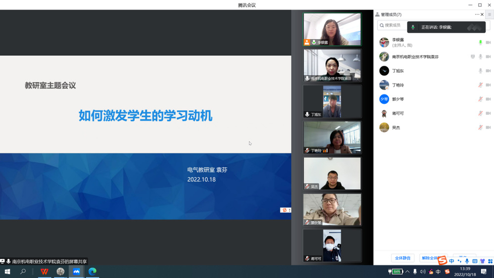 为了激发和培养学生的学习动机,满足学生的学习需要,10月18日在博学楼108,召开“如何激发学生的学习动机——以电气控制与PLC应用课程为例”研讨会,因疫情原因部分老师隔离在家,以腾讯会议线上形式加入研讨。此次教研活动由袁芬老师主持,全体教研室教师参加。