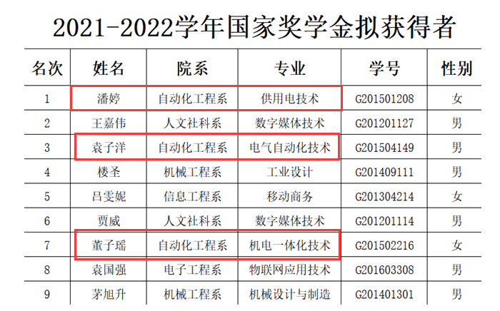 根据《省教育厅关于做好2022年普通高校国家奖学金有关工作的通知》苏教助函〔2022〕9 号、《教育部 财政部关于印发<本专科生国家奖学金评审办法>的通知》教财函〔2019〕105号、《江苏省学生资助资金管理办法》、《江苏省学生资助管理实施细则》文件精神。我校认真落实国家奖学金评审相关细则,各系部通过召开系部国家奖学金评审小组会议,认真贯彻落实国家奖学金评定要求,本着公开、公正、公平的原则,经学生个人申报,班级评议通过,上报系部评议小组,系部对申请学生各项指标、材料进行初审并提出意见,经系部同意,公示完毕,正式上报学校大学生资助管理中心。