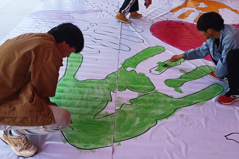 活动进行第二阶段,自动化工程系心理气象站将准备已久的巨幅海报平铺在走廊上,夺得许多老师同学的目光。巨幅海报上“春风润心护航成长”八个大字也正好回应了本次活动举办的意义。分发涂色工具后,大家随即撸起袖子加油干,不到一小时的时间,一张张五彩斑斓的巨幅海报就映入大家的眼眶,接着“心理画家”们就将八条海报拼接成一张,效果震撼无比,八个手掌指向一颗红色爱心,象征自动化工程系师生心向一处,海报上还有遨游天空的飞鸟和自由飘荡的白云,呈现出一幅积极向上的美好愿景!